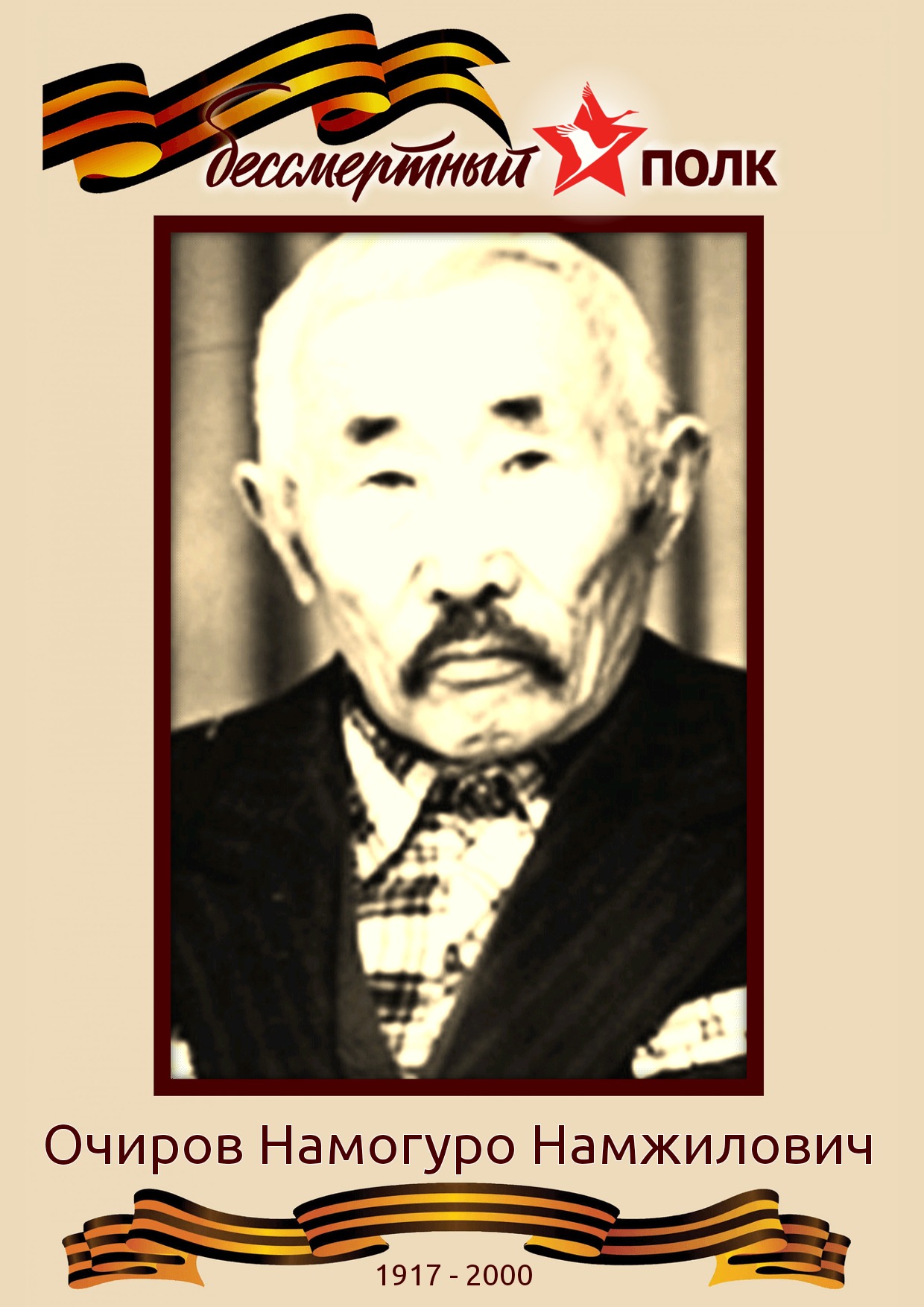 Я горжусь своими дедушкой и прадедушкой, их скромным вкладом в Великую Победу. Я и все наши родственники бесконечно благодарны им и всем, кто приближал Победу. Если не было бы Победы, то не было бы меня! Не было бы нас! Мой дедушка Очиров Намогуро Намжилович (1917 – 2000гг) – единственный сын своих родителей, сам отец 11 детей, дед 31 внука, прадедушка 34...